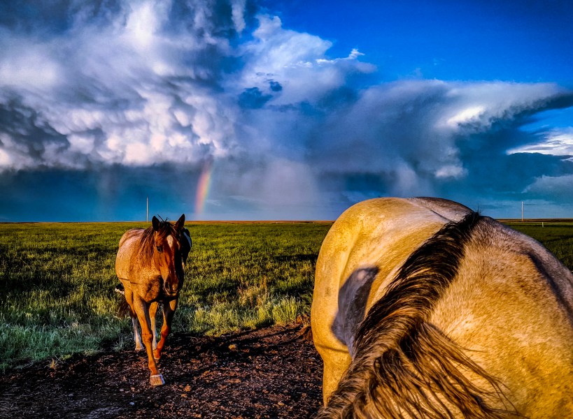 I let the ebbing streaks of the remaining afternoon sun soak in. I look at you and the corners of my mouth begin to turn upward. Setting the brush down, I give you one last run over with my hand, untie the lead rope and lead you to the corral. Watching you roll three times all the way over and half way twice, and I just smile- the kind of smile a young cowgirl does when she’s just spent the day with her horse. Thank you, my old roan friend- For all those happy trails- the rocky pasts, the more assured present and the good Lord willing, the happiest of future miles…